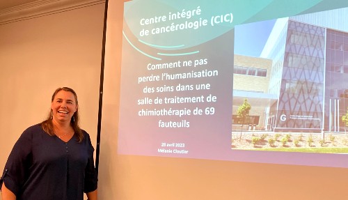 Comment ne pas perdre l'humanisation des soins dans une salle de traitement de chimiothérapie de 69 fauteuils, conférence présentée par Mélanie Cloutier, chef d'unité de la salle de traitement du Centre intégré de cancérologie.