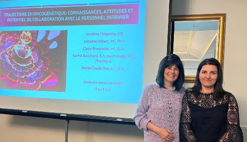 Trajectoire en oncogénétique : le potentiel de la collaboration avec le personnel infirmier, avec la participation de Claire Brousseau, infirmière clinique oncogénétique du cancer du sein et Karine Bouchard, agente de planification, de programmation et de recherche du réseau de cancérologie.