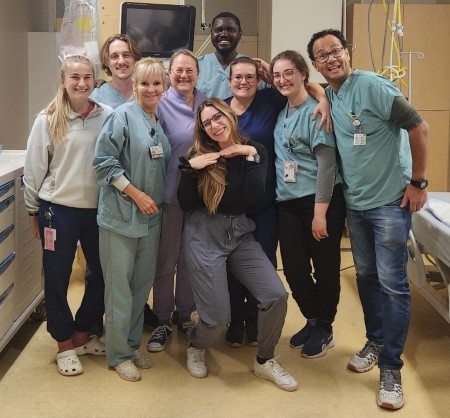 De gauche à droite : David Bellemare, infirmier de recherche; Gabrielle Ouellet, chargée de projets, agente d’évaluation, de programmation et de recherche à la Direction des ressources informationnelles; Marie Morin, conseillère en développement organisationnel (anciennement conseillère en soins infirmiers soins intensifs); Andrée-Anne Bérubé, coordonnatrice soins critiques (anciennement chef d’unité soins intensifs et Grands brûlés, Hôpital de l’Enfant-Jésus); Marie-André Cloutier, conseillère en soins infirmiers à la Direction des ressources informationnelles; Anick Boivin, infirmière de pratique avancée, soins intensifs à la Direction des soins infirmiers; Dr Alexis Turgeon-Fournier, chercheur et intensivite-anesthésiologiste; David Bertrand, directeur général, Hospitalis.