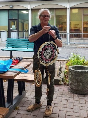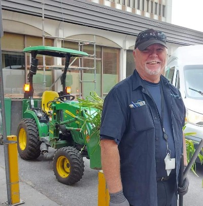 À gauche : Éric Côté, ouvrier de maintenance à HSFA, qui a déménagé des vivaces et ramassé des sacs de tourbe avec son tracteur. À droite : Jocelyn Paquet, préposé aux bénéficiaires au bloc opératoire d’HSFA, a fabriqué des mobiles et les a installés dans le jardin.