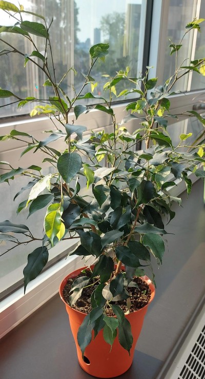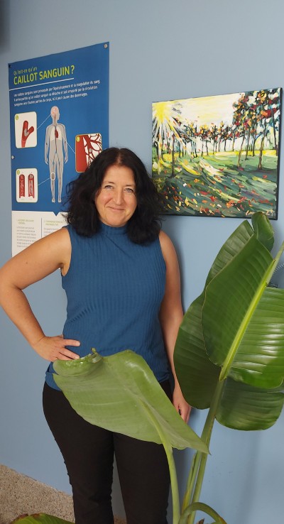 À gauche : Isabelle à côté de l’une de ses toiles au département de chirurgie vasculaire. À droite : Ficus Benjamina offert par la Dre Violaine Dalens et placé dans la salle d’attente du département de chirurgie vasculaire d’HSFA.