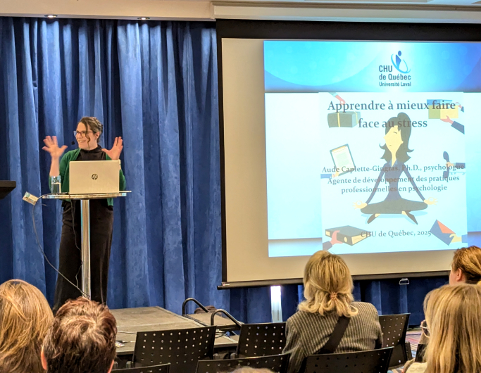Enfin, après les tirages des prix de présence, Mme Aude Caplette-Gingras, psychologue au CHU de Québec-Université Laval, a beaucoup intéressé l’auditoire avec sa présentation fort utile « Apprendre à mieux faire face au stress ».