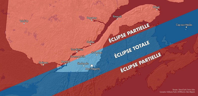 Au Québec, la dernière éclipse solaire totale s’est produite en 1972 et, après celle du 8 avril prochain, la suivante n’aura lieu qu’en 2106. Il faut donc profiter de ce moment privilégié! Rappelons qu’une éclipse solaire se produit de jour, lorsque la Lune passe entre le Soleil et la Terre (image principale). Les éclipses totales de Soleil visibles à un endroit donné de la Terre sont des évènements très rares et de courte durée (moins de 8 minutes). La totalité de l’éclipse peut être observée uniquement sur une zone étroite qui correspond au passage de l’ombre portée de la Lune sur la surface terrestre.