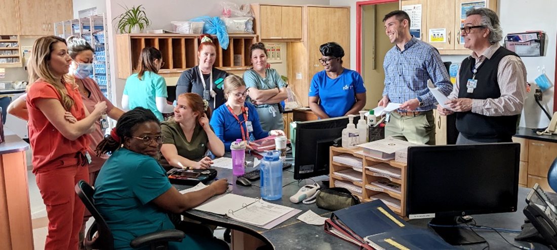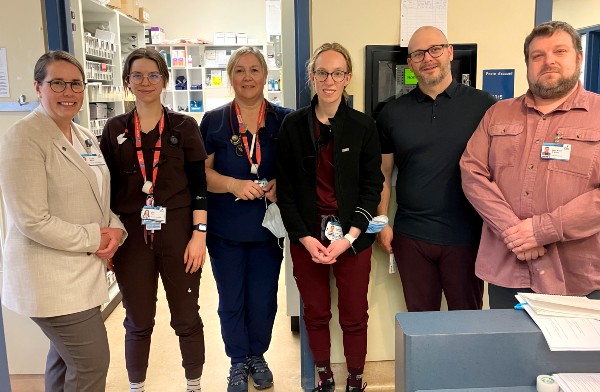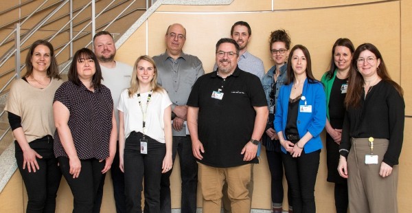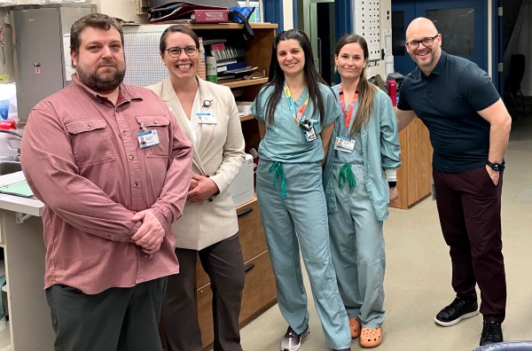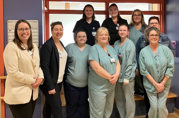 De gauche à droite : Chantal Savard, conseillère cadre clinique, CISSS de Laval; Charlaine Laplante, service des communications, CISSS de Laval; Jean-Sébastien Leclerc, chef d’unité BE-5000, Hôpital de l’Enfant-Jésus; Jacinthe Collin, adjointe à la directrice des soins infirmiers, CISSS de Laval; Sébastien Poitras, chargé de projet, Direction des ressources informationnelles, Laval-Laurentides-Lanaudière; Dave Girard, conseiller en soins infirmiers, CHU; Benjamin Lemieux, conseiller en soins infirmiers, CHU; Sarah Savard-Bradette, infirmière clinicienne, CHU; Christine Leroux, conseillère cadre en soins infirmiers, CHU; Isabelle Lessard, directrice adjointe, Innovation et qualité des pratiques en soins infirmiers, CHU; Julie Nicol, chef d’unité BE-5000, Hôpital de l’Enfant-Jésus.
