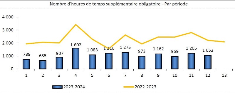 Tous ces travaux ont eu des retombées positives sur la diminution des heures en temps supplémentaire obligatoire (TSO), passant de 27 683 heures en 2022-2023 à 12 808 heures en 2023-2024, ce qui représente une diminution de 54 % du TSO à la P12.