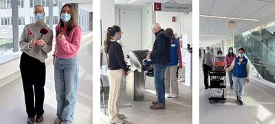 Les étudiant(e)s de Cœurs en visite de passage au CHU ont remis des fleurs fabriquées à la main et ont offert du jus aux usagers et aux usagères du Centre intégré de cancérologie du CHU.