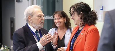 Photo principale : Le Dr Pierre Fréchette, fondateur de la traumatologie au CHU de Québec-Université Laval et du service des Évacuations aéromédicales, discute avec Marie-Élaine Lemieux de la Fondation du CHU de Québec. En arrière-plan : Danielle Goulet, présidente-directrice générale du CHU de Québec-Université Laval.