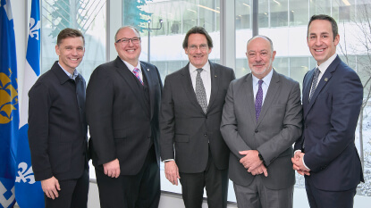 Photo principale : de gauche à droite : Dominic Gagnon, professionnel de recherche dans le laboratoire du Pr Richard; Christopher Bérubé, stagiaire postdoctoral en chimie médicinale dans le laboratoire du Pr Biron; Dave Richard, chercheur de l’axe Maladies infectieuses et immunitaires au CRCHU et spécialiste de la malaria; Éric Biron, chercheur de l’axe Endocrinologie et néphrologie spécialisé dans le développement de nouveaux agents thérapeutiques.