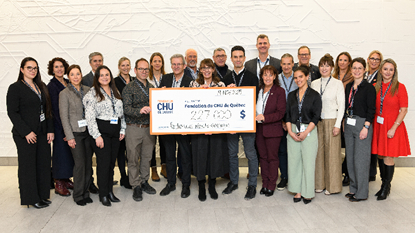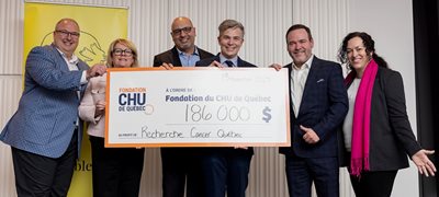 Photo principale (de gauche à droite) : Martin Beaumont, président-directeur général du CHU de Québec-Université Laval; Marie-Claude Houle, présidente et chef de direction chez EBC inc.; Samer Hussein, chercheur au Centre de recherche du CHU de Québec-Université Laval; Martin Simard, chercheur et directeur de l’axe Oncologie au Centre de recherche du CHU de Québec-Université Laval; François Tremblay, président de Prevost et Groupe Volvo Canada; Marie-Élaine Lemieux, directrice développement stratégique - partenariats corporatifs majeurs, Fondation du CHU de Québec. Photo : Les Festifs.