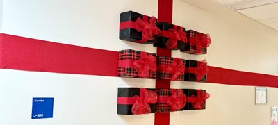 Grâce à leur ingéniosité et leur esprit collaboratif, deux décors uniques ont vu le jour : une pyramide de cadeaux scintillants (photo ci-dessous) ainsi qu’un mur habillé de cadeaux et de ruban aux couleurs festives (photo principale). Ces créations incarnent à la fois le partage et la générosité.