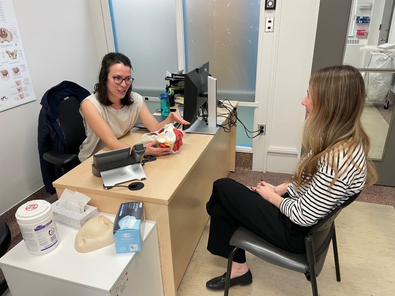 Photo principale : L’intérêt de Clémence et Gabrielle (jouant ici le rôle d’une patiente) pour le Centre de santé pelvienne réside dans l’aide apportée aux femmes pour favoriser un retour à l’autonomie dans les aspects fonctionnels du quotidien.