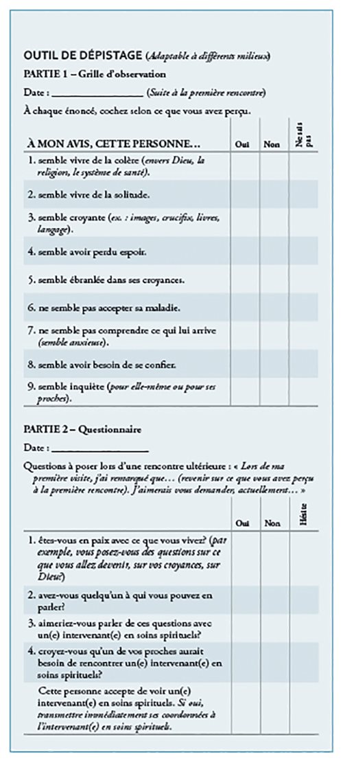 L’importance du dépistage a pris de l’ampleur depuis une quinzaine d’années, notamment aux États-Unis, tel qu’en font foi les nombreux outils développés ayant pour but d’établir l’anamnèse du patient en matière de spiritualité. Des grilles telles que HOPE3 (Anandarajah & Hight, 2001), SPIRIT4 (Maugans, 1996), FACT5 (LaRocca-Pitts, 2009), FICA6 (Puchalski & Romer, 2000; Borneman, Ferrell & Puchalski, 2010) et SPIR (Frick, Riedner, Fegg, Hauf, & Borasio, 2006), pour ne nommer que celles-ci, s’adressent aux équipes de soignants et permettent notamment de dépister les patients qui devraient être référés à une personne spécialisée dans les soins spirituels7.