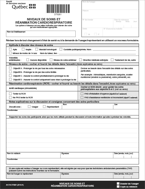 Des sections distinctes du niveau de soins permettent de consigner la décision sur la RCR et celles en lien au soutien ventilatoire d’urgence à l’intention des services préhospitaliers. On recommande fortement au médecin d’utiliser la section prévue pour rapporter les noms des participants ainsi que les mots utilisés durant la discussion et toute information qui pourra aider à préciser les volontés du patient. Enfin, le médecin doit signer et inscrire la date où le formulaire a été rempli.