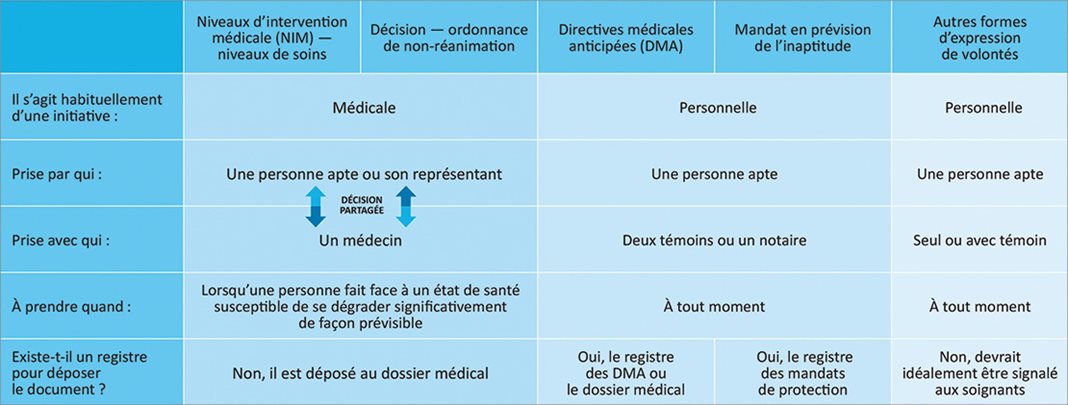 Il existe plusieurs outils de planification préalable des soins, les principaux étant : les niveaux de soins, le mandat en cas d’inaptitude, les directives médicales anticipées (DMA) et le testament de vie (tableau 1). Toutes ces modalités de planification préalable s’appliquent uniquement lorsqu’un patient devient inapte à consentir aux soins. Les niveaux de soins sont le seul outil qui implique un dialogue entre le médecin et le patient.