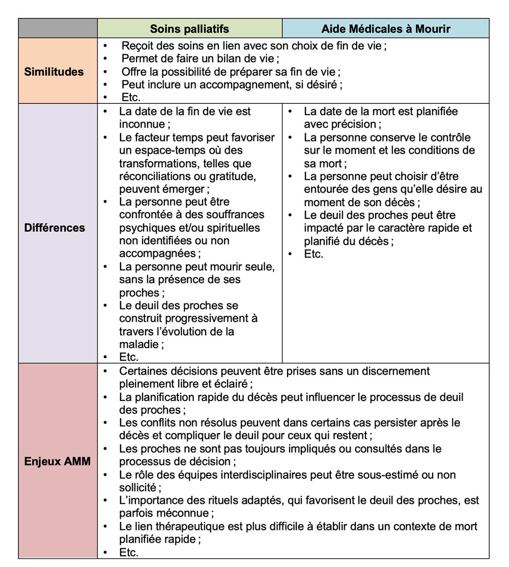 Voici un tableau sommaire des similitudes et différences entre une mort en soins palliatifs et une mort planifiée (tableau que vous pourrez compléter)