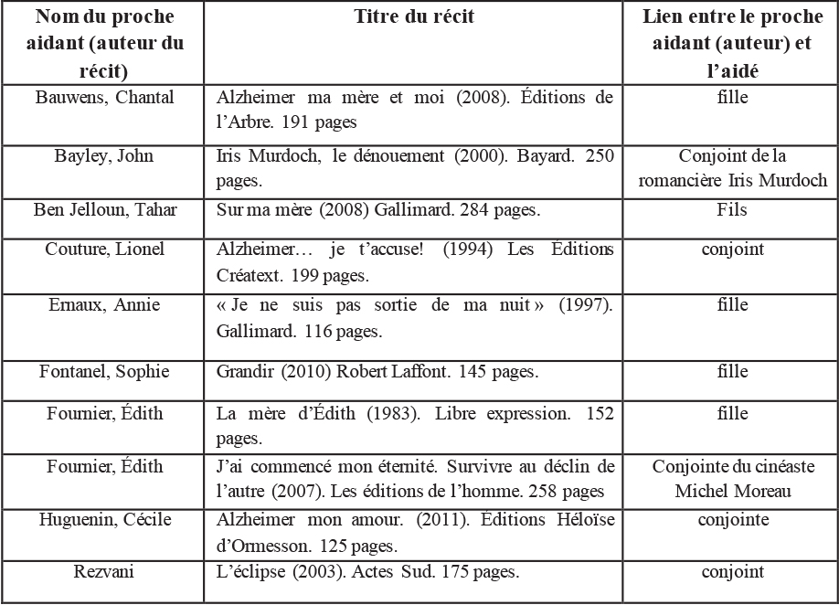 De nombreux récits autobiographiques témoignant une expérience de proche aidant ont été publiés. Basés sur un échantillonnage par choix raisonné (Patton, 1990) les récits ont été sélectionnés à partir des critères suivants :