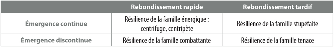 Les familles tenaces sont celles pour qui la période de naufrage est longue et le rebondissement se déroule de façon discontinue. Ce type de famille, comme son nom l’indique, fait preuve de ténacité face à l’adversité et parvient malgré tout à émerger. Ces familles peuvent avoir besoin de soutien professionnel, et ce, durant un laps de temps plus long. Dans ce contexte, il importe d’adapter l’offre de service à leurs besoins pour éviter qu’elles ne se sentent délaissées par le système de santé. Dans le cadre de la présente recherche, une mère qui se trouvait à la tête d’une famille de type tenace avait renoncé aux services d’aide, car ils se limitaient à une période de 15 semaines. Comme elle jugeait cette période insatisfaisante, elle préférait éviter les professionnels. Par contre, lorsqu’une intervenante lui a offert un suivi sur une période indéterminée, elle a pu s’investir dans la thérapie, ce qui a permis éventuellement à la famille de rebondir.