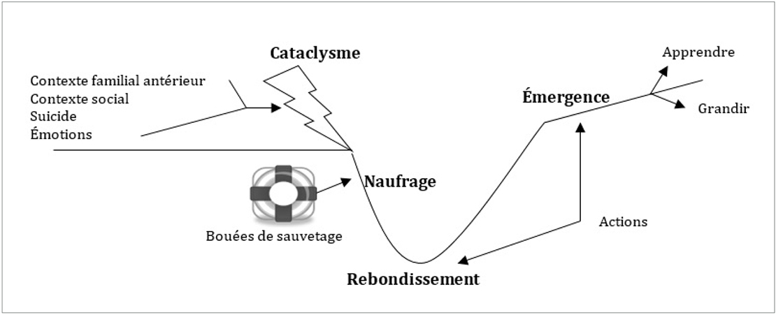 Le processus de résilience des familles endeuillées par le suicide d’un adolescent s’intitule donc : Émerger malgré la blessure indélébile. En effet, un élément important du discours des endeuillés était que la blessure causée par le suicide ne disparaît jamais complètement, mais s’estompe avec le temps, telle une cicatrice : « c’est une […] blessure indélébile » (X. B., père) « … une cicatrice facile à se rouvrir » (C. T., mère). L’ampleur du remous ou du cataclysme qu’occasionne le suicide dépend beaucoup du contexte antérieur au suicide. Ainsi, le contexte familial avant le suicide ainsi que le contexte social peuvent influencer la façon dont la famille va réagir au suicide. De plus, le suicide lui-même, c’est-à-dire qui en a fait la découverte, comment l’annonce a été faite, quelles ont été les réponses des premiers répondants vont aussi influencer la façon dont la famille vivra cette expérience. À tout ce contexte s’ajoutent les émotions vécues, ce qui amplifie le cataclysme.