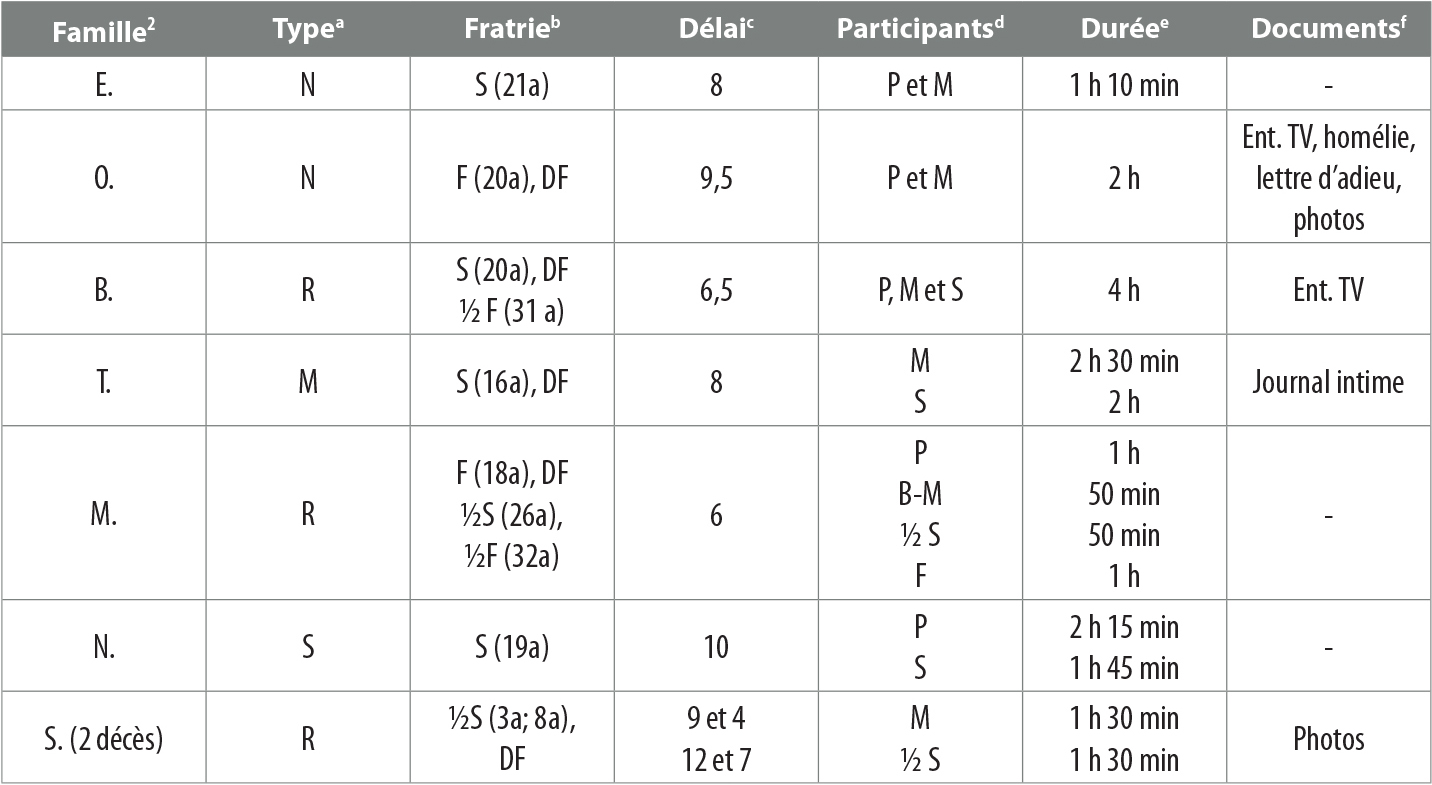 b Composition de la fratrie. Informations sur les membres incluant leur âge au moment du suicide et leur présence au domicile familial (DF) lors du suicide : S = sœur F = frère ½F = demi-frère ½S = demi-sœur