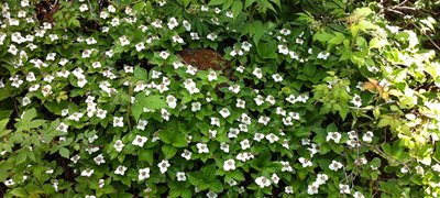 Tapis de quatre-temps (Cornus Canadiensis) en fleurs dans le boisé autour du monastère de la Croix glorieuse.