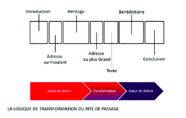 Soulignons également que les étapes du canevas sont agencées selon la logique interne du rite de passage qui marque les transitions majeures du cycle de vie (Van Gennep 1981). Cette logique vise à actualiser la transformation de l’état du patient (Turner 2002) en représentant son passage du statut de vivant à celui de défunt. Notons que si les rites de passage entourant la mort ne sont pas synchronisés avec le changement d’état biologique (le décès) d’une personne auquel ils se rapportent, ils représentent et « donnent à vivre » ce changement d’état aux participants dans le cadre d’un espace-temps cérémoniel. Ainsi, ces rites produisent des effets réels – cognitifs et émotifs – chez ceux qui y prennent part, bien qu’il s’agisse d’événements symboliques.