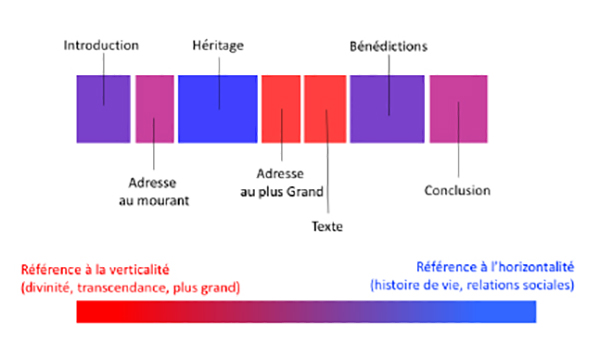 Ainsi, comme le montre la figure 2, le canevas revêt des teintes différentes selon les étapes : les actions rituelles au cœur du rite tendent à impliquer des significations axées sur la verticalité alors que les étapes qui sont dédiées à la participation des proches, comme « L’héritage », revêtent quant à elle des teintes d’horizontalité. De façon générale, les étapes sont colorées de teintes intermédiaires, entre les extrêmes du continuum vertical-horizontal, puisque les références à ces pôles sont souvent utilisées conjointement dans un discours, un texte, ou un commentaire.