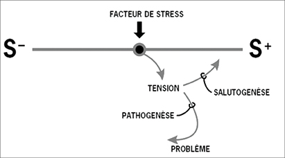 La théorie d’Antonovsky était à l’origine destinée à être une théorie du stress puisqu’il s’agissait là de son objet de recherche (Antonovsky, 1987; Antonovsky, 1979). Pour Antonovsky, le stress est un élément omniprésent dans les activités de la vie quotidienne. Logiquement, il nomma donc les facteurs perturbant les activités de la vie quotidienne des « facteurs de stress (ou stresseurs) ». Sous l’influence de ces facteurs de stress, un individu se retrouve sous tension. Dès lors, soit il suc- combe à cette tension et se dirige vers une situation dite « pathogénique », soit il la surmonte et se dirige à l’opposé vers un pôle dit « salutogénique » d’un continuum santé-maladie (Roy et O’Neill, 2012).