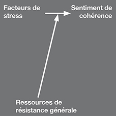 Pour résumer le cadre théorique de la salutogenèse, disons qu’une ressource de résistance générale (et son utilisation adéquate) permet de gérer efficacement un ou des facteurs de stress de la vie quotidienne qui du coup, n’ont pas (ou peu) d’impact sur le sentiment de cohérence qui lui, opérationnalise la salutogénèse, c’est-à-dire le mouvement vers la santé le long d’un continuum santé-maladie.