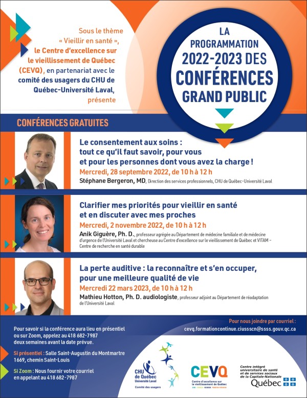 Le Centre d’excellence sur le vieillissement de Québec (CEVQ), en partenariat avec le comité des usagers du CHU de Québec-Université Laval, propose au grand public une série de conférences gratuites portant sur des thèmes liés au vieillissement.