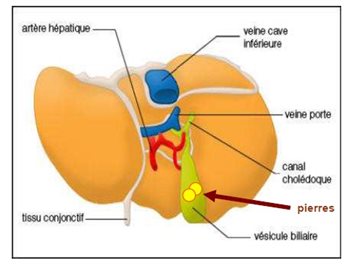 Cholécystectomie : Chirurgie qui consiste à enlever la vésicule biliaire et les calculs (pierres) qui y sont présents. Cette chirurgie se fait à l'aide d'une incision au niveau de l'abdomen (environ 10 à 12 cm). Cette chirurgie est pratiquée sous anesthésie générale.