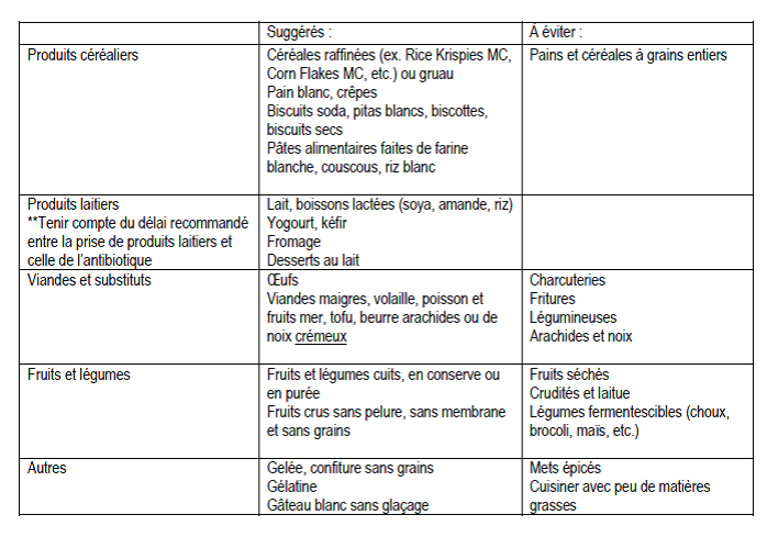 Il est recommandé de réintroduire graduellement l’alimentation habituelle afin de vérifier la tolérance de l’intestin. Essayer un aliment nouveau à la fois. Pour les fruits frais, assurez-vous qu’ils soient bien mûrs et enlevez la pelure. Si vous éprouvez des inconforts, attendez quelques jours et retentez à nouveau l’aliment. Cette phase peut être rapide pour certaines personnes, alors que pour d’autres, cela prendra une à deux semaines.