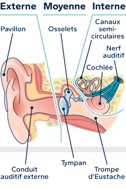 L’oreille moyenne : comprend le tympan, les osselets et la trompe d’Eustache
