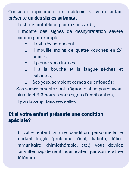 - Après 1 à 2 jours, la majorité des enfants sont capables de reprendre leur alimentation habituelle.