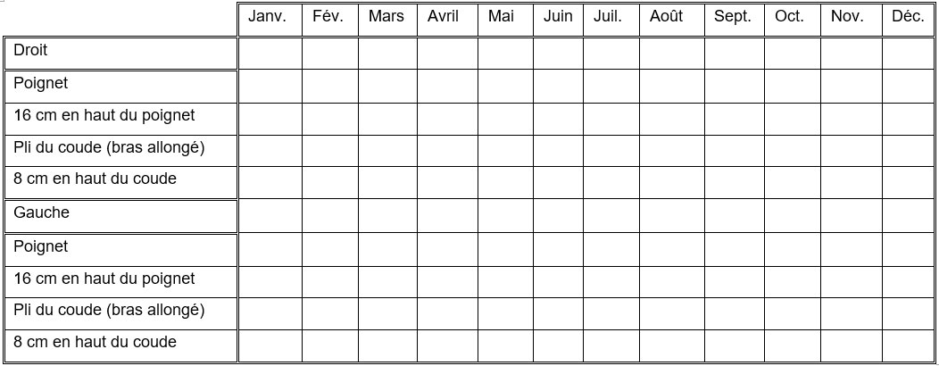 Au besoin, vous pouvez télécharger ce document que vous pourrez imprimer afin d'y consigner vos résultats de mesures des bras.