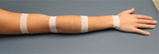 Mesurer vos bras avec un ruban à mesurer, aux 4 endroits spécifiés dans la photographie ci-dessous. Comparer les deux bras. Encercler le mois où vous notez les premières mesures. Poursuivre la mesure de vos bras chaque mois afin d’y déceler tout changement du côté opéré.