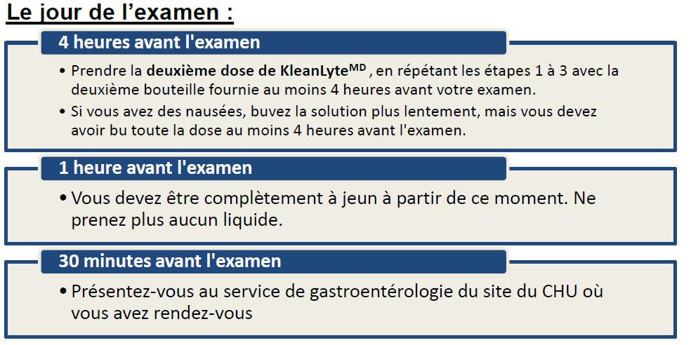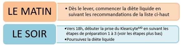 Le gros intestin doit être complètement propre pour que l’examen puisse être précis et complet. À l’aide du KleanLyteMD, vous devez bien préparer votre intestin, sinon votre examen devra être refait. Suivant la préparation, les selles devront être liquides de couleur jaunâtre à clair.