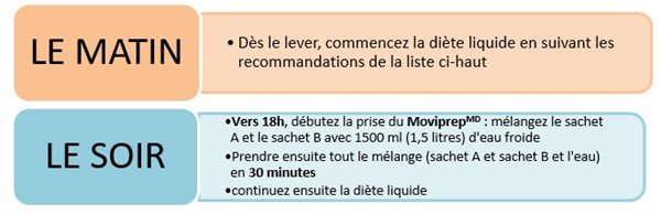 Si KleanLyteMD n’est pas disponible à votre pharmacie, prenez le MoviprepMD en remplacement.