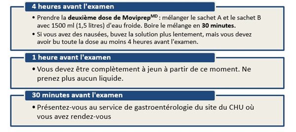 Si vous êtes diabétique et que vous prenez de l’insuline, des consignes spéciales vous seront données par une infirmière afin de vous indiquer à quel moment cesser les injections et les reprendre. Cette infirmière aura informé le médecin qui prescrit ce médicament pour vous. Si vous n’avez pas reçu ces consignes, appelez au centre de rendez-vous de gastroentérologie.