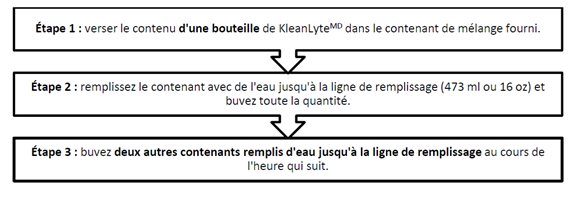 Chaque emballage de KleanLyteMD contient deux bouteilles. Une à prendre la journée avant l’examen et l’autre la journée de l’examen. Les étapes de préparation 1 à 3 sont les mêmes pour les deux prises. Le médicament doit absolument être dilué avec de l'eau avant d'être pris.