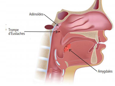 Les adénoïdes sont situées près des trompes d'Eustache et peuvent les bloquer provoquant otites et infections des oreilles. Elles peuvent obstruer (boucher) l'entrée d'air du nez dans la gorge, rendant la respiration par le nez difficile.