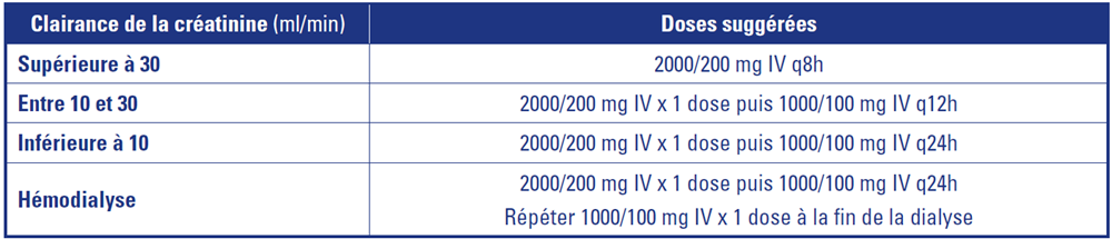 Différentes posologies se retrouvent dans la monographie de produit. Il n’existe cependant pas de recommandation franche quant à la dose à utiliser selon l’indication clinique. Afin d’assurer une antibiothérapie efficace et pour simplifier les ordonnances, le sous-comité de surveillance de l’utilisation des antibiotiques recommande une dose unique pour tous les patients adultes, ajustée selon la fonction rénale.