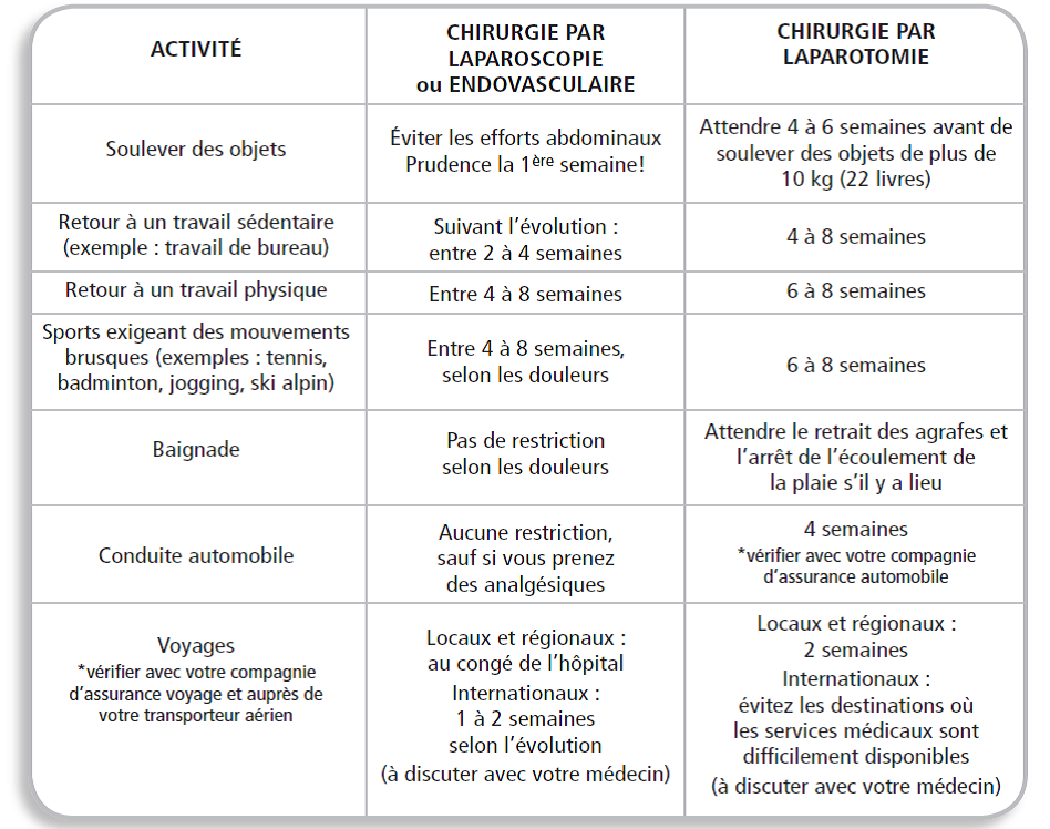 Vous devez revoir votre chirurgien dans un délai de 4 semaines après votre chirurgie. Un rendez-vous à la clinique vasculaire vous sera donné le jour de votre départ. Vous y ferez un examen pour les jambes (laboratoire vasculaire) et une rencontre avec votre chirurgien sera prévue.