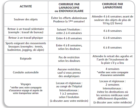 Vous devez vous reposer durant les 4 à 6 semaines qui suivent l’opération. Privilégiez plusieurs périodes de repos au cours de la journée, car vous pourrez vous sentir fatigué très rapidement, ce qui est normal.