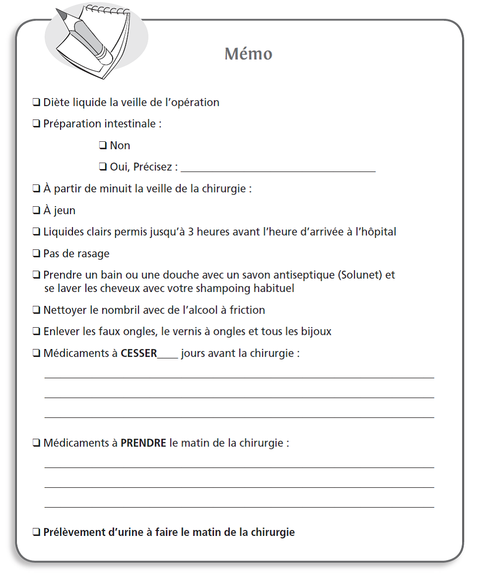 Ce guide d’enseignement et d’accompagnement vise à répondre à plusieurs de vos interrogations et vous aider à bien comprendre l’intervention qui sera pratiquée. Si certains aspects concernant les avantages et les risques reliés à la chirurgie et l’anesthésie vous semblent encore obscurs, n’hésitez pas à en discuter avec votre chirurgien ou votre anesthésiologiste.