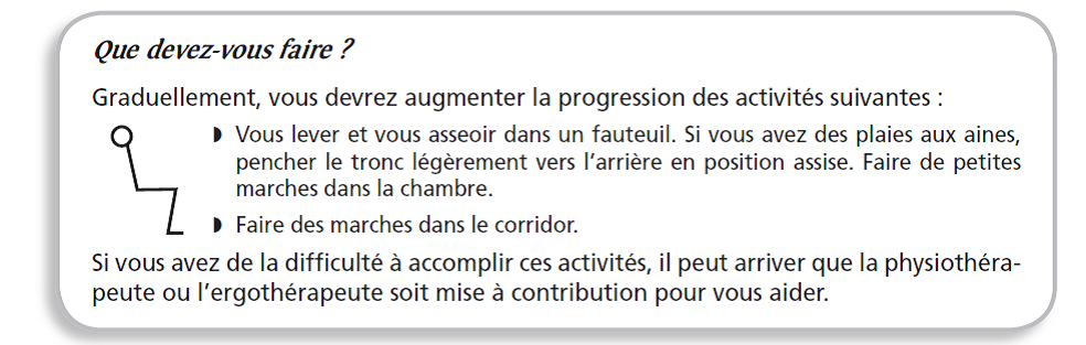 Pendant les 4 premières semaines, vous pouvez circuler modérément dans les escaliers, prendre des petites marches à l’extérieur et faire des travaux légers. Évitez la station debout de façon prolongée.