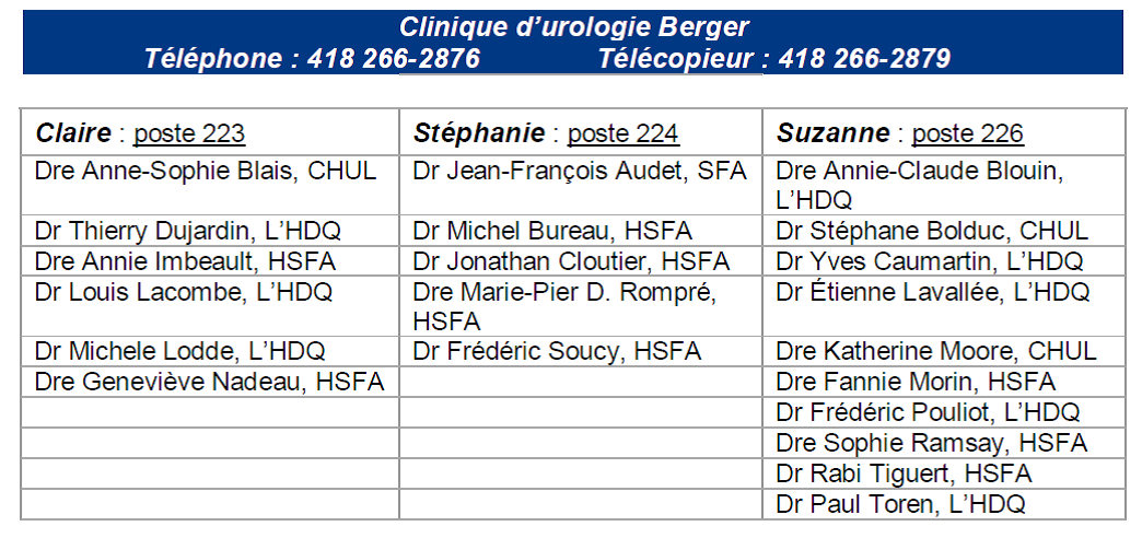 Pour tout autre problème non urgent en lien avec votre chirurgie, veuillez contacter la secrétaire de l’urologue ayant effectué la chirurgie à la Clinique d’Urologie Berger sur les heures ouvrables en semaine.