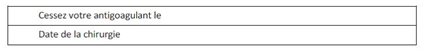 • Aspirine ou anticoagulant à cesser selon la recommandation du chirurgien.