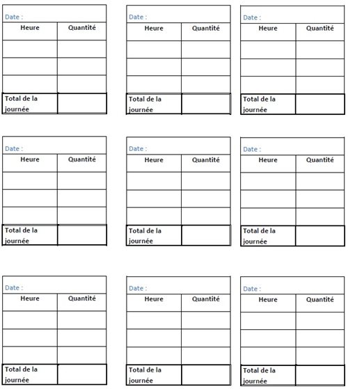 Notez la quantité de liquide du contenant gradué sur les tableaux prévus à cette fin. Apportez ces informations à votre prochaine visite médicale.