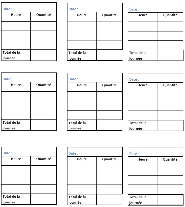 Notez la quantité de liquide du contenant gradué sur les tableaux prévus à cette fin. Apportez ces informations à votre prochaine visite médicale.