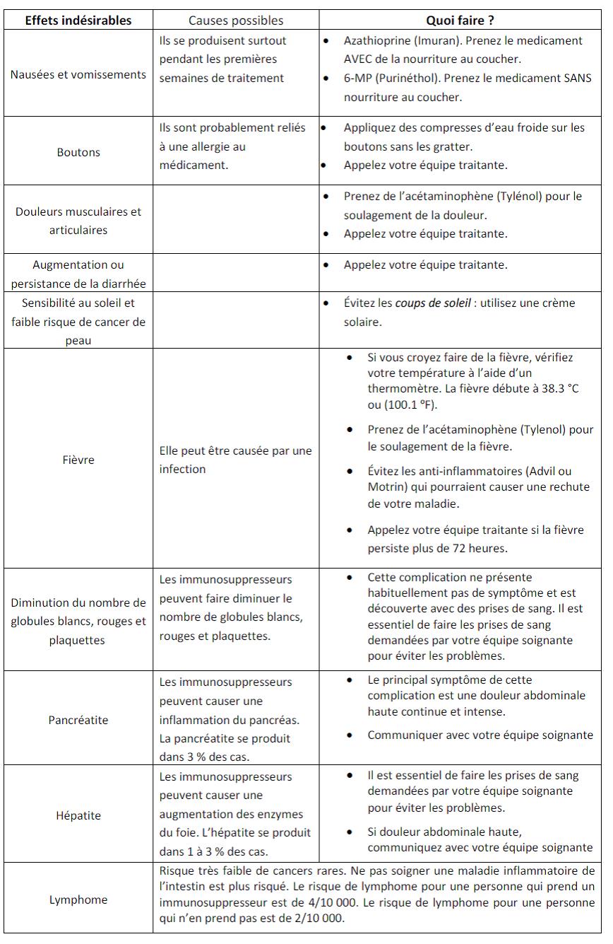 Les immunosuppresseurs sont souvent débutés en même temps que des corticostéroïdes. Les immunosuppresseurs doivent être pris à tous les jours. Les immunosuppresseurs peuvent être pris pendant des années. Si vous vous sentez mieux, c’est que vos immunosuppresseurs sont efficaces. Vous devez le continuer pour ne pas avoir un retour des symptômes de votre maladie inflammatoire de l’intestin.